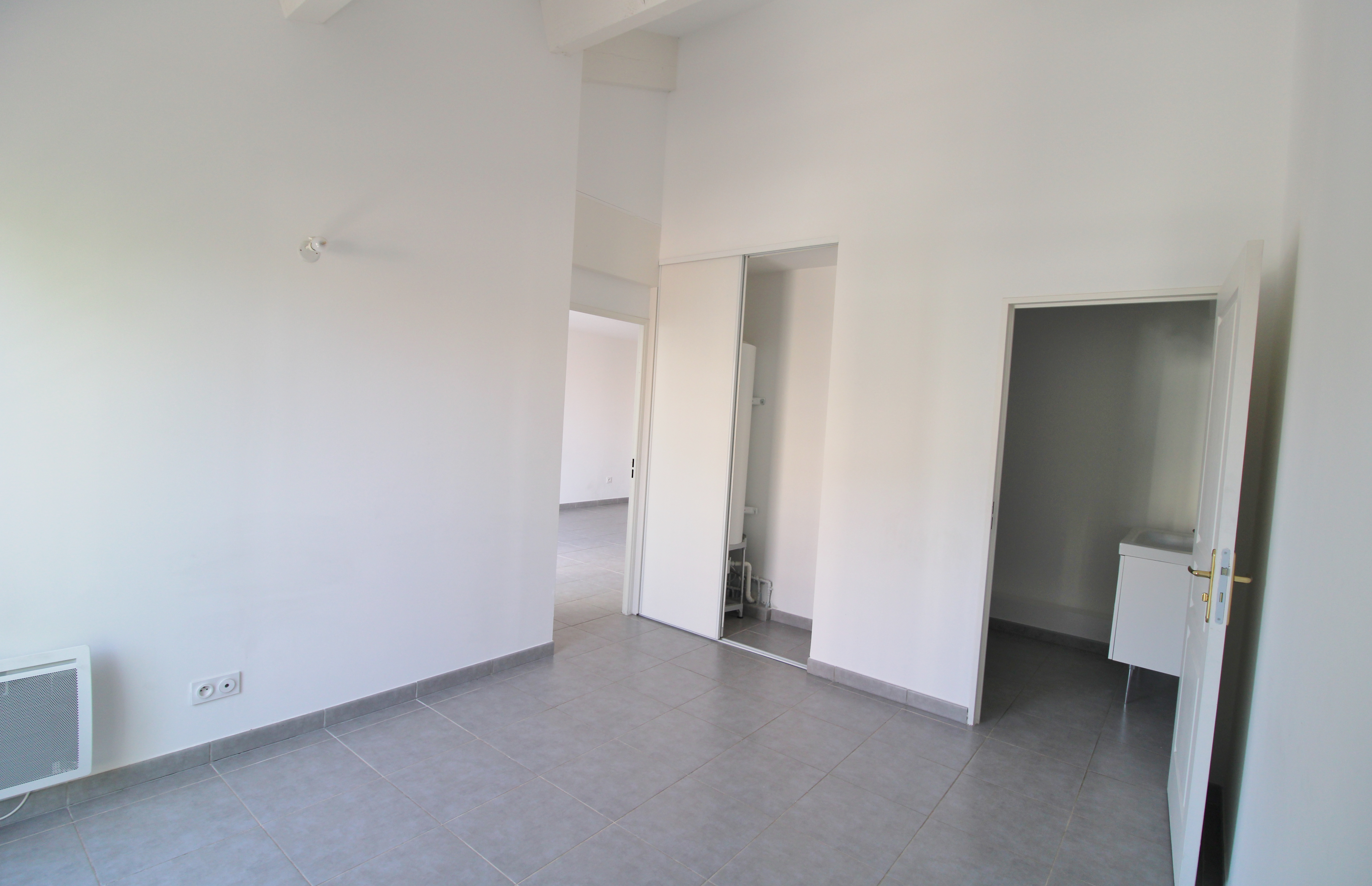Il est composé au rez-de-chaussé d'un hall, un séjour ouvert sur cuisine aménagée et équipée, une chambre avec rangements, une salle d'eau et WC séparés. Au 1er étage, une chambre avec sa salle d'eau attenante.