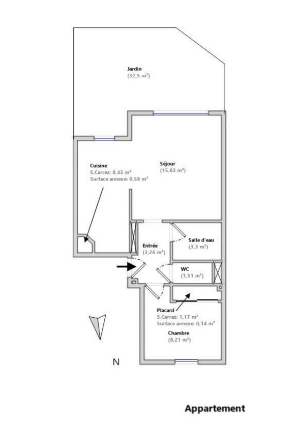 Il est composé d'un hall d'entrée desservant toutes les pièces principales, un séjour avec cuisine semi-séparée de 24 m², donnant sur la terrasse et le jardin avec sa vue dégagée, une chambre de 9,38 m² avec placards de rangements, une salle d'eau et des W.C. séparées.